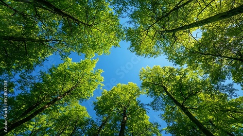 © SprintZz, Obraz premium Trees in forest from below, green tops of trees, blue sky background