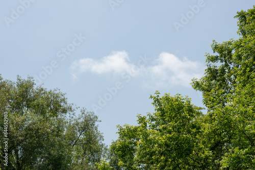 Fototapeta premium trees in spring with blue sky, clouds, and space for copy