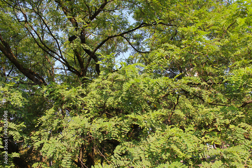 © Iryna, Obraz premium trees in the forest,branches of acacia tree with green leaves