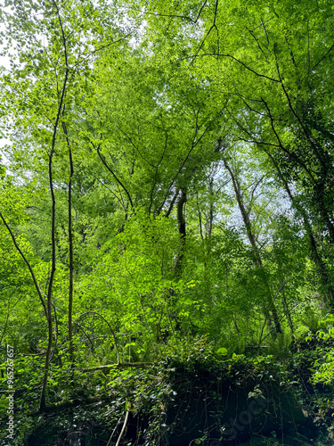 © schankz, Fototapeta premium Trees in the forest grow on rocky cliffs of the mountains. Summer