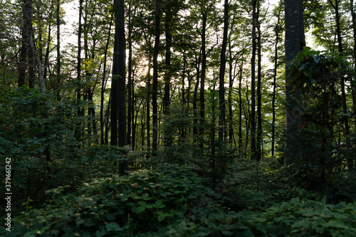 © ArtmediaworX, Obraz premium Trees in the forest with sun setting in the distance