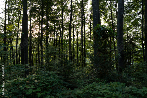 © ArtmediaworX, Obraz premium Trees in the forest with sun setting in the distance