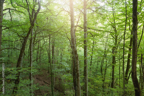 Fototapeta premium Trees in the mountain forest at evening time.