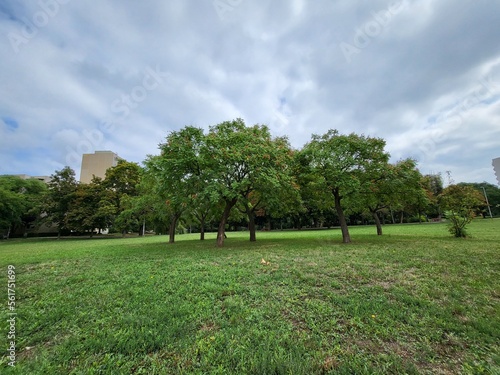 Naklejka premium Trees in the park at summer with green grass and blue sky