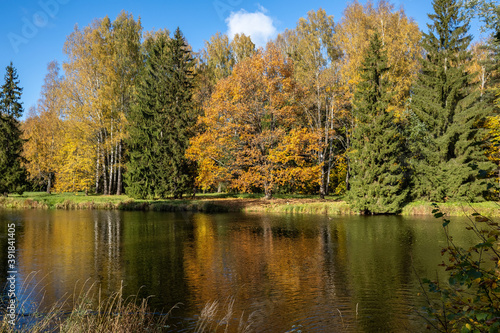 © Vitaly, Fototapeta premium Trees in the park covered with bright yellow leaves on the shore of the pond. Golden autumn in Pavlovsk.