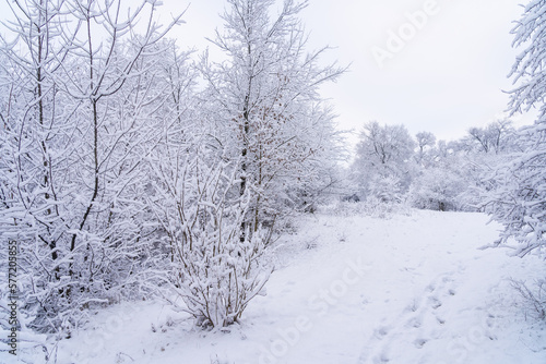 © Iurii Gagarin, Fototapeta premium Trees in the snow. Winter background, selective focus