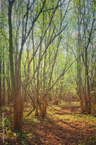 Naklejka premium Trees in the spring deciduous forest. Beautiful shady forest.
