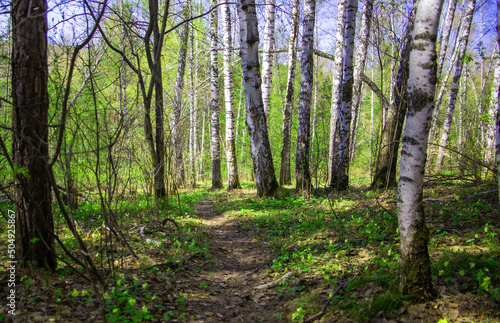 © Андрей Букреев, Fototapeta premium trees in the spring forest, against the background of sprouting grass and flowers