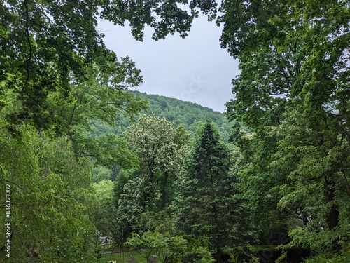 © Smn Jlt, Obraz premium Trees in the woods on a rainy day, Poconos Mountains, Pennsylvania - May 2024