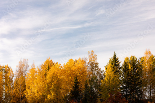 © Juhku, Fototapeta premium Trees in vibrant autumn colors in golden sunlight landscape