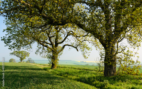 © Daniel, Fototapeta premium Trees line agricultural landscape in spring in the Wolds, Yorkshire, UK.