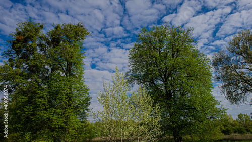 Fototapeta premium Trees on a green meadow and blue sky, rural landscape.