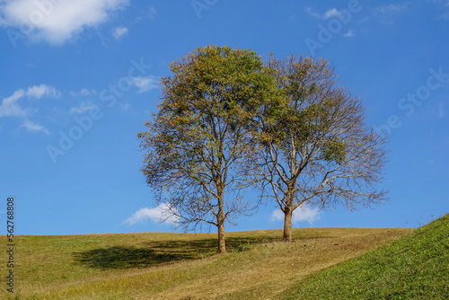 © Aoy_Charin, Obraz premium 2 trees on top of a high mountain, sky view with scattered white clouds. Soft and selective focus.