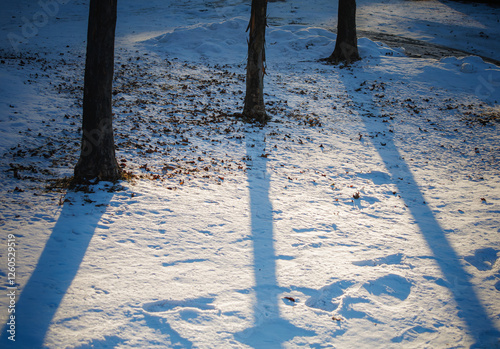 © Sepe44, Fototapeta premium trees shadows on snow-covered ground on a sunny winter day.