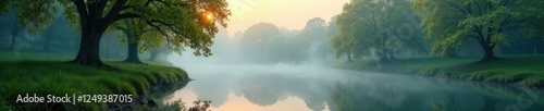 Naklejka premium Trees surrounding a small pond with misty atmosphere, reflection, peacefulness