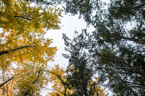 © Yi, Fototapeta premium trees with yellow and green leaves under cloudy sky inside forest
