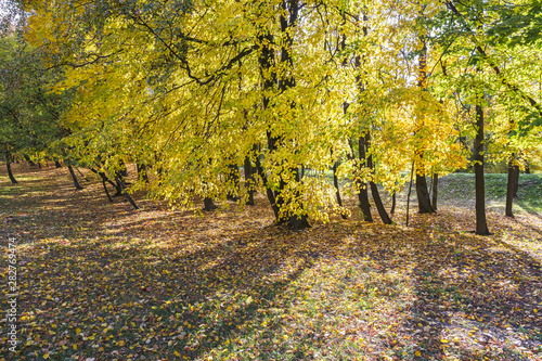 © Mr Twister, Naklejka premium trees with yellow foliage in autumnal sunny day. park ground covered with dry fallen leaves