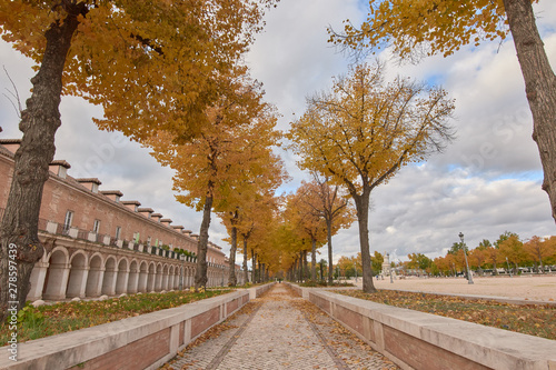 Naklejka premium Trees with yellow leaves in autumn and cloudy sky in Aranjuez