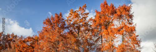 Fototapeta premium Treetops of cypress trees in autumn with blue sky