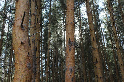 Fototapeta premium Treetops rustle in the forest in the wind. Blue sky. Pine forest