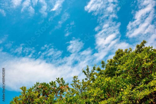 © 子程 龚, Obraz premium Treetops under blue sky and white clouds