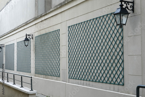 © luzulee, Fototapeta premium Treillis de bois sur un mur dans un passage de résidence