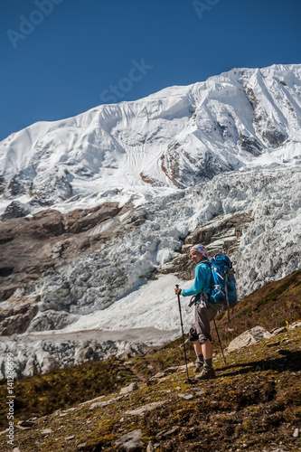 Fototapeta premium Trekker in front of Manaslu glacier on Manaslu circuit trek in Nepal