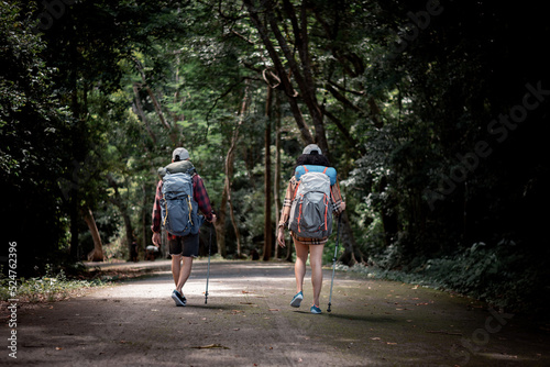 © APchanel, Fototapeta premium trekker tourist backpack ,hat with trekking stick . they show hold hand help adventure trekking at beautiful national park waterfall in summer vacation is eco tourism concept