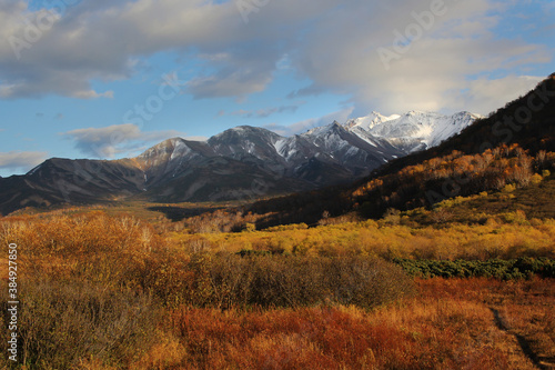 Fototapeta premium Trekking around volcanoes of Kamchatka in fall season