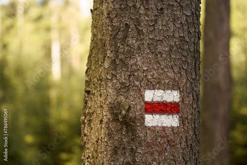 © AlexGo, Naklejka premium Trekking Signpost. Red Marker for Forest Trails and Adventures