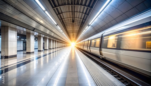 Naklejka premium Tren en movimiento en estación de metro moderna con luz solar brillante al final del túnel