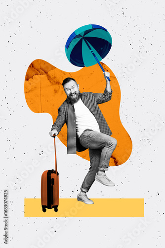 Obraz premium Trend artwork banner sketch 3D photo collage of young man walk hold umbrella baggage travel agency global abroad destination vacation trip