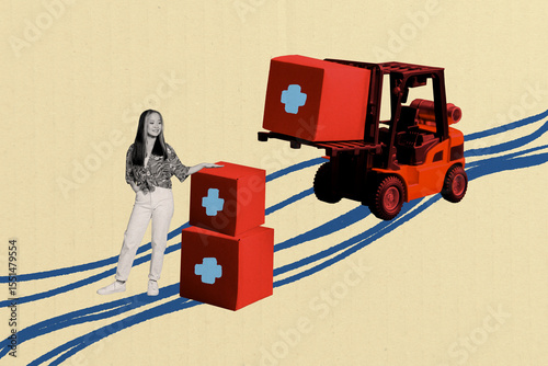 Fototapeta premium Trendy art creative full zine photo collage of happy girl postal worker stand truck vehicle box plus donation transportation