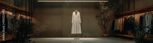 Naklejka premium Trendy clothing display in modern interior with plants.
