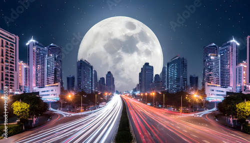 Fototapeta premium Trendy Cute seamless pattern, streams of light trail in the city at night with big moonlight.