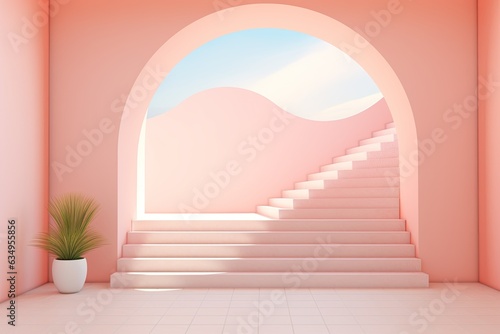 © Postproduction, Obraz premium Trendy geometric stairs and podium in pastel interior. Concept of sleek modern architecture.