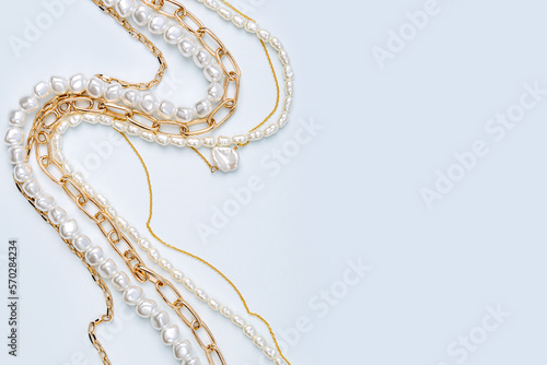 Fototapeta premium Trendy jewelry with chains and pearl necklace. Stylish golden bijouterie. Fashion accessories.