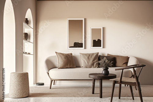 Fototapeta premium Trendy minimalistic japandi modern interior in beige tones. Home fashion...