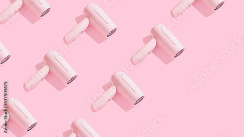 © Popovo, Naklejka premium Trendy pattern made of hair dryer on sunny pink background with diagonal copy space. Creative hairdressers wallpaper.