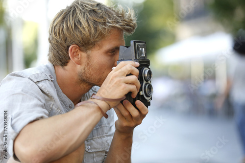 Fototapeta premium Trendy photographer using vintage camera