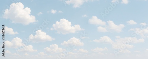 © Jafree, Obraz premium Trendy white color 2026 year. Blue sky with fluffy white cloud. Bright sunny summer day for outdoor activities, calm weather background. Trendy color 2026.