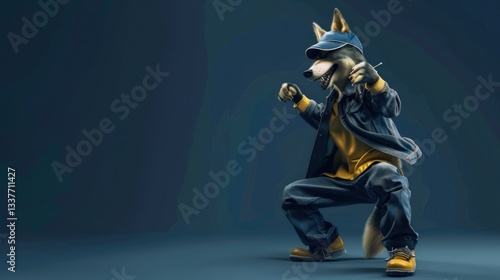 © Kerah, Fototapeta premium Trendy wolf dancing cheerfully on a dark blue background, AI generated image