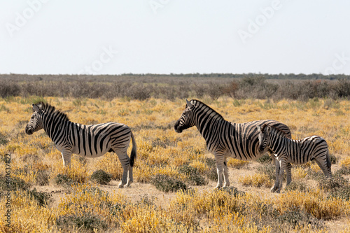 © Lola Fdez. Nogales, Fototapeta premium Tres cebras en parque nacional Ethosa en Namibia.