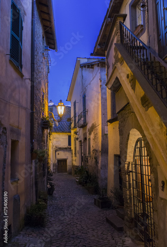 Fototapeta premium Trevignano street at dusk / A typical street of little town of Trevignano Romano, on Bracciano lake, near Rome, Italy at the dusk, nicely illuminated by lamps