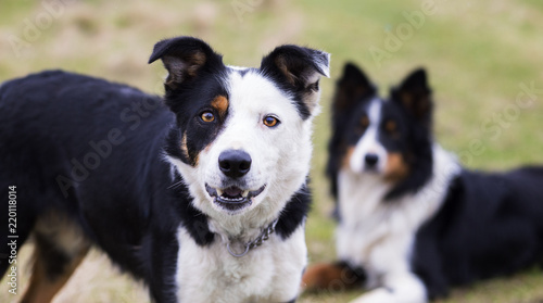© Kieran, Obraz premium Tri-colored border collie looking at camera with second dog in background