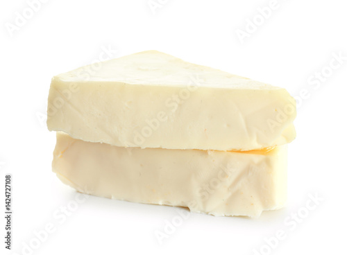Fototapeta premium Triangles of tasty processed cheese on white background