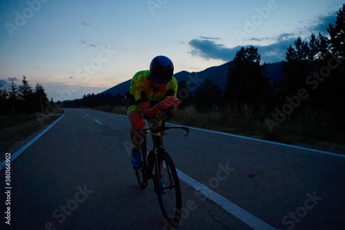 © .shock, Obraz premium triathlon athlete riding bike at night