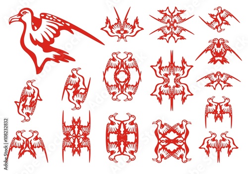 Fototapeta premium Tribal albatross set. Decorative patterns in the form of an albatross. Red on...