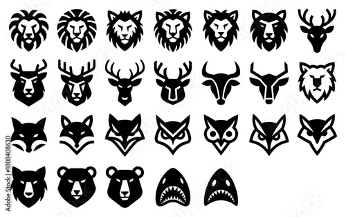 © Faheem, Naklejka premium Tribal Animal Head Logotype Icon Set. Wild Animals, Predator, Lion, Deer, Bear, Fox, Owl and Shark Face. Nature Symbol Vector illustration