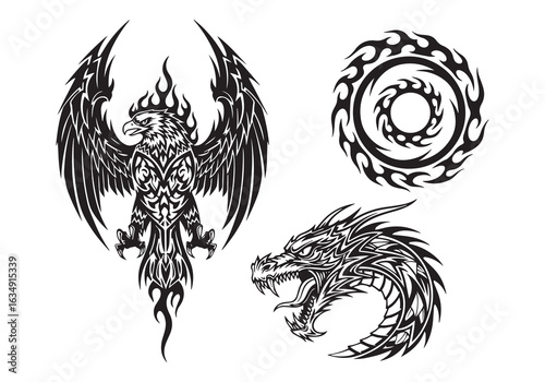 Fototapeta premium Tribal Eagle, Dragon Head, and Flame Circle Tattoo Designs